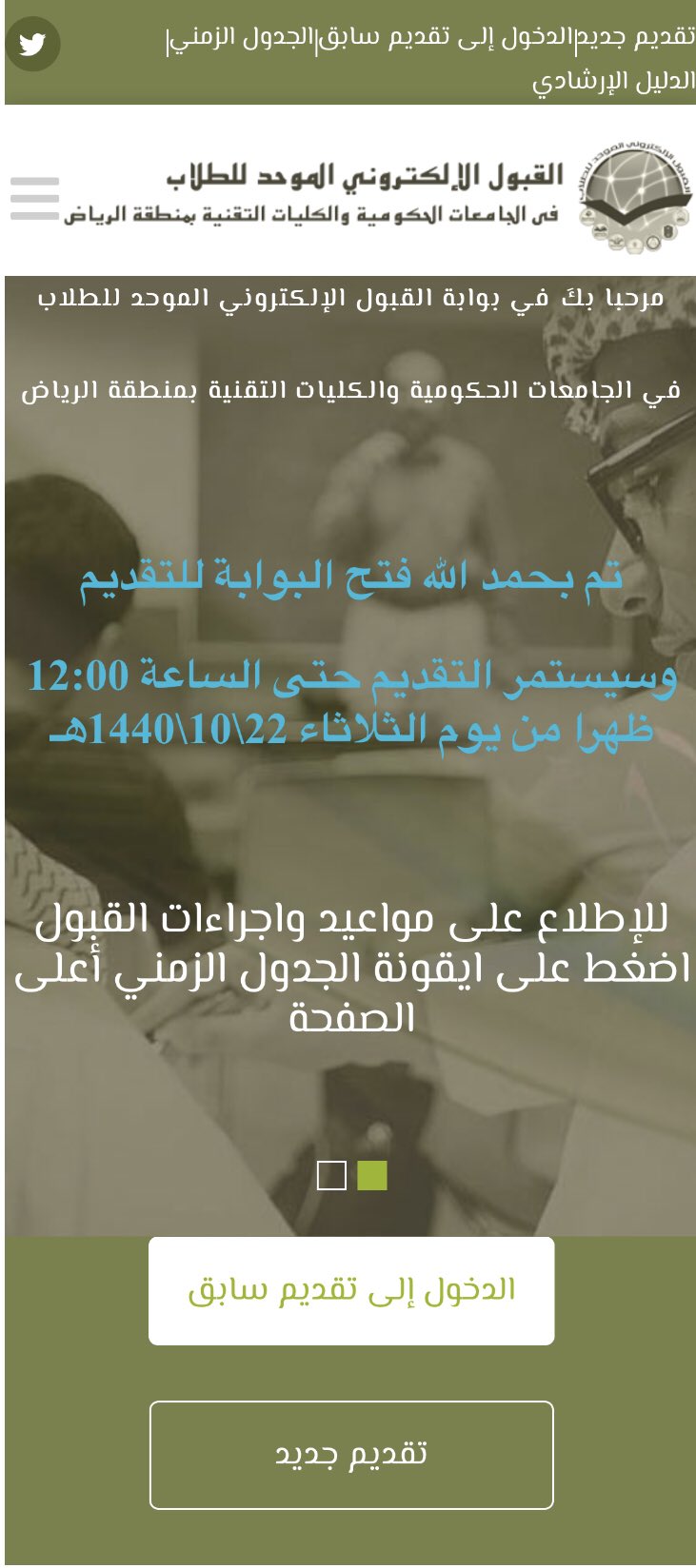 عمادة القبول والتسجيل A Twitter تم بحمد الله فتح بوابة القبول الإلكتروني الموحد للطلاب في الجامعات الحكومية والكليات التقنية بمنطقة الرياض وسيستمر التقديم حتى الساعة 12 00ظهرا من يوم الثلاثاء الموافق 1440 10 22هـ التقديم